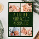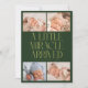 Modern Christmas theme birth announcement card featuring a bold typography text that says "a little miracle arrived" with 4 of your newborn pictures. This is a birth announcement card for the holiday seasons! Add your pictures, birth stats, and a message! The background is green.