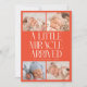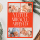 Modern Christmas theme birth announcement card featuring a bold typography text that says "a little miracle arrived" with 4 of your newborn pictures. This is a birth announcement card for the holiday seasons! Add your pictures, birth stats, and a message! The background is red.