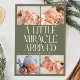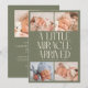 Modern Christmas theme birth announcement card featuring a bold typography text that says "a little miracle arrived" with 4 of your newborn pictures. This is a birth announcement card for the holiday seasons! Add your pictures, birth stats, and a message! The background is sage green.