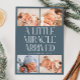 Modern Christmas theme birth announcement card featuring a bold typography text that says "a little miracle arrived" with 4 of your newborn pictures. This is a birth announcement card for the holiday seasons! Add your pictures, birth stats, and a message! The background is slate blue.