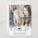 Anuncie o seu segundo grau ou formando universitário com este cartão de lançamento moderno, com um FORMANDO de tipografia com letra na moda, acentuado com um boné de formatura na sua escolha de cores e 4 fotos (3 na frente e 1 na parte traseira). O verso oferece um campo de texto para informações sobre as realizações, atividades e planos futuros do seu formando. ALTERAÇÕES: Altere qualquer cor de texto ou de gráfico na EDIT. ASSISTÊNCIA: para obter ajuda com a modificação/personalização do design, transferir o design para outro produto ou, se você quiser coordenar itens, entre em contato com o designer ANTES DE ENCOMENDAR através da guia MENSAGEM de Bate-papo Zazzle ou envie um email para makeitaboutyoustore@gmail.com.