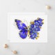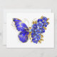 Joias, azul, safira, borboleta de flor cintilante com asa decorada com flores azuis preciosas com folhas douradas em fundo branco.