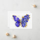 Joias, azul, safira, borboleta de flor cintilante com asa decorada com flores azuis preciosas com folhas de ouro em fundo branco.
