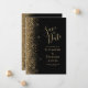 A borda esquerda deste elegante casamento moderno salve o cartão de data apresenta uma borda falsa dourada. O texto personalizável combina uma letra pálida de cor dourada, uma letra copperplate e uma letra itálica num fundo preto. O verso apresenta um design preto e dourado correspondente.