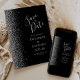 A borda esquerda deste elegante casamento moderno salve o cartão de data apresenta uma borda cintilante. O texto personalizável combina a escrita manual de cinzas prateadas, fontes copperplate e itálico em um fundo preto. O verso apresenta um design preto e prateado correspondente.