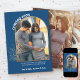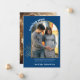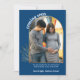 Anúncio personalizado de nascimento de fotos em azul e ouro. O modelo de foto está configurado para você adicionar 2 fotos - uma na frente, que é moldada em um arco dourado com folhagem fina e, uma foto de retrato sangrado no cheio, no verso. "em breve" está escrito em letras negrito, tipografia arquivada e o restante do texto é totalmente editável para você personalizar com sua mensagem personalizada, data de vencimento do bebê e nome(s). Uma design moderna e chique para compartilhar as maravilhosas notícias de sua gravidez.