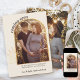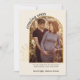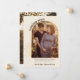 Anúncio personalizado de nascimento de fotos em creme neutro em sexo, castanho e ouro. O modelo de foto está configurado para você adicionar 2 fotos - uma na frente, que é moldada em um arco dourado com folhagem fina e, uma foto de retrato sangrado no cheio, no verso. "em breve" está escrito em letras negrito, tipografia arquivada e o restante do texto é totalmente editável para você personalizar com sua mensagem personalizada, data de vencimento do bebê e nome(s). Uma design moderna e chique para compartilhar as maravilhosas notícias de sua gravidez.