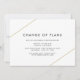 Cartão de anúncio geométrico moderno de adiamento do casamento com duas linhas de ouro, uma em cima à esquerda e uma em baixo à direita, juntamente com o título, "Mudança de Planos" sobre um fundo branco. Um design minimalista que ainda aparece como chic e na moda. Estes cartões de anúncio são uma forma excelente de avisar seus convidados que seu casamento foi adiado.