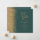 A borda esquerda deste elegante casamento moderno salve o cartão de data apresenta uma borda falsa dourada. O texto personalizável combina manuscritos dourados, copperplate e fontes itálicas em um fundo verde escuro. O verso apresenta um design verde e dourado correspondentes.