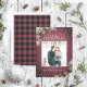 Compartilhe seus desejos de Natal e sua foto favorita de casamento neste feriado com este design rustico de burgundy, com tipografia com letras de mão, sua foto favorita, xadrez de búfalos de burgundy, luzes de fadas e ramos de pinho com flocos de neve com brilho prateado. Copyright Elegant Invites, todos os direitos reservados.