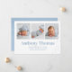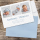 Esta design apresenta um lindo e simples azul de bebê, um divertido modelo de fotos multifotos, uma simples tipografia de tendência na moda, com o texto de estatísticas de natalidade, com adoráveis e doces roupas bonitinhas para bebês, capa de jeans azuis, t-shirt branca vermelha para bebês, um simples design mínimo minimalista, um doce e adorável anúncio de bebê, para novos cartões com fotos para bebês recém-nascidos