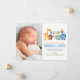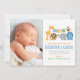 Um grupo de amigos animais da selva, incluindo um leão, girafa, pássaro, macaco, elefante e hipopótamo, se reúnem para dar as boas-vindas a um menino moderno e doce safari, chamado cartão de anúncio de nascimento com foto de retrato. sotaques de padrão de bolinhas e stripe. Branco com cores azuis, verdes, laranja, azuis, castanho e cinza.