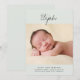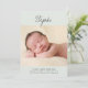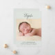 Este anúncio minimalista de nascimento de fotos apresenta uma grande foto, uma simples tipografia de script e uma paleta de cores verde e cinza. A frente do anúncio de nascimento inclui o primeiro nome do recém-nascido em letra manuscrita. Uma foto grande é posicionada abaixo do nome. No final do anúncio de nascimento, adicione o nome do cheio do bebê, a data de nascimento, as estatísticas de nascimento e os seus nomes. O texto é escrito em cinzas escuras de carvão contra fundo verde macio. Você pode adicionar fotos na parte traseira do cartão, se desejar.