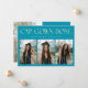 Modern and minimal graduation announcement photo card featuring 3 photos on the front and 1 on the back. The text at the top says "CAP. GOWN. DONE." Add the graduate's name, information, and message to personalize this card. Aqua blue color.