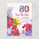 Celebre um marco em plena floração com este vibrante cartão postal de aviso de data comemorativa de 80 anos, apresentando um “80” cheio de flores coloridas e uma borda de jardim brilhante.