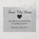 Cartão postal de casamento Save the date com brilho prateado falso e símbolo de coração preto desgastado pelo tempo. Ótimo para lembrar os convidados do seu casamento luxuoso e sofisticado. Nome do noivo e da noiva personalizável com texto de tipografia elegante e sofisticada. Design sofisticado com textura de fundo prateado e brilhos / faíscas falsas. Cartões luxuosos.