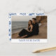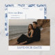 Procurando uma maneira elegante de anunciar o seu casamento? Este cartão-postal personalizável de "salve a data" permite que você faça o upload da sua foto de noivado favorita, mantendo o design sofisticado e moderno. Com uma disposição de tipos elegante que combina com roupas mais escuras e ambientes de praia, o verso apresenta um padrão azul de chinoiserie atemporal para um acabamento clássico. Perfeito para casamentos na praia, casais modernos ou qualquer pessoa que queira um toque refinado e pessoal.