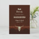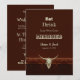 Anúncio de casamento country western cowboy comer beber diversão madeira marrom. Caveira de touro rústica. Use um pouco de humor com esses convites engraçados e fofos em estilo fazenda. Comer, Beber, porque estamos nos casando pode ser personalizado. Design trendy, estilo vintage antigo do oeste selvagem. Animal de fazenda legal. Personalize a caligrafia e a tipografia. Direitos autorais da imagem Marg Seregelyi Photography.