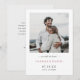 Esta simples carta de apresentação do anúncio de casamento com fotos em chic mostra sua foto na frente. Seus primeiros nomes são destacados em uma elegante sombra de ouro rosa e por amplo espaço em branco com sua data e localização abaixo deles e uma mensagem 'nós amarramos o nó! acima de seus nomes. Este efeito é reforçado pela nossa utilização não convencional de maiúsculas e minúsculas. Embora tenhamos usado todas as maiúsculas para seus nomes, usamos minúsculas exclusivamente para o outro texto na frente, mesmo quando maiúsculas são normalmente exigidas, como em sua cidade e nome de estado, etc. Tomamos esta liberdade no espírito de seguir as regras, a menos que as quebremos de forma consistente, criando assim a nossa própria regra! ;) Além de ter a opção de mudar a cor, a fonte e o tamanho do texto em ambos os lados, é claro que você pode usar maiúsculas onde você vê o ajustado. Você também pode alterar ou excluir campos de texto - você pode, por exemplo, mudar 'nós amarramos o nó!' para 'nós nos casamos!' ou algo mais. Ou você pode incluir seu sobrenome e seus primeiros nomes na frente, ou alterar o formato de data, ou excluir o local sem substituí-lo pelo seu próprio, para uma aparência ainda mais simples. Escolhemos cantos nítidos padrão como a forma padrão da placa, mas cantos arredondados também funcionam maravilhosamente com esta design. Então, verifique ambas as opções no modo de edição e veja qual é a sua capacidade! A cor de texto padrão na frente é preta e na parte de trás é uma cinza muito escura que é preta. Você pode alterar qualquer cor ou fonte do texto para se adequar ao seu estilo. Como fundo padrão, na frente escolhemos uma base transparente que permite que a cor do papel sirva simplesmente como tom base. Na parte de trás, escolhemos uma cor de fundo chamada Fumaça Branca, é uma cinza muito clara que é principalmente branca. Você pode mudar o fundo de cada lado se quiser. Colocamos algum texto de marcador de posição no verso para que você exclua e substitua por sua própria mensagem, com ou sem seus nomes, se você quiser assinar manualmente quando receber os cartões. Mas você pode simplesmente optar por excluir nosso texto de marcador de posição e deixar o vazio de trás completamente para que você possa escrever uma mensagem manualmente em cada cartão e assinar seus nomes. O tipo de papel padrão, matte, tem um calor suave e resiste a manobras, então é uma escolha excelente para escrevendo sua própria mensagem. Você pode editar isso e escolher outro tipo de papel. Em qualquer caso, lembre-se de que há texto de marcador de posição também no verso e apague todo o nosso texto de amostra/marcador de posição em ambos os lados do cartão, assim como nossa foto de amostra. Faça com que este cartão de anúncio elegante e minimalista seja exclusivamente seu com as ferramentas intuitivas de design, sua foto favorita e sua inspiração!
