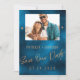 Casamento moderno de moda Salve nossa data com letra de tipografia de ouro em cobre e sua foto personalizada sobre um fazer de fundo aquoso azul escura um casamento elegante de luxo, salve o cartão de anúncio de data. +++++++++++++ Fácil de personalizar com sua foto favorita e detalhes em ambos os lados!