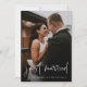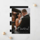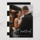 Recem casados! Anuncie o seu casamento à família e amigos com esta simples e moderna carta de fotos. Ele apresenta uma cobertura de script manuscrito branco com faixas pretas e brancas. Personalize adicionando nomes, data, local e uma foto.
