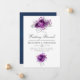 Rosas roxas de ameixa escura e folhagem tropical com brilho prateado postam convites para brinchos de casamento com uma lavagem de cor azul marinho à água inversa.