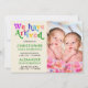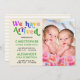 Chegamos! Cartas coloridas divertidas anunciando o nascimento de seus novos bebês gêmeos e apresentando sua foto favorita de seus novos bebês! Personalize esta design com a sua fotografia, o primeiro, o meio e o sobrenome do bebê, a data de nascimento, a hora, o peso e o comprimento.