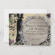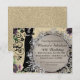 Um vestido preto na moda num pano de fundo dourado com flores roxas e espirais decorativas junto com um círculo prateado floresce onde se pode personalizar o seu evento. Vibrações femininas elegantes.