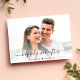 Anúncio do noivado de música com sua foto sobreposta com "feliz para sempre" em um roteiro elegante com baloiços e seus nomes unidos com um coração. No verso, adicione duas fotos adicionais, personalize sua mensagem e adicione seus primeiros nomes em um script semelhante a assinatura.