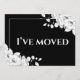 Chic Modern Black and White Floral Moving Card. Fundo preto chic, decorado com um arranjo floral branco delicado e moderno estilo de esboço no canto superior direito e canto inferior esquerdo. Combinação de fontes chic de caligrafia elegante e tipografia branca serif.