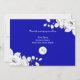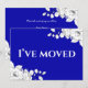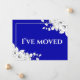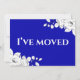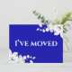 Cartão de anúncio de mudança floral branco azul real moderno chic. Fundo azul real chic, decorado com um arranjo floral branco delicado e moderno estilo esboço no canto superior direito e canto inferior esquerdo. Combinação de fonte chic de caligrafia elegante e tipografia branca serifada.