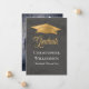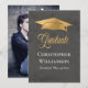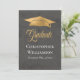 Boné clássico de cor dourada e texto de parabéns com o nome dos seus formandos e outro texto. Foto de um lado para honrar seu formando. Simples e moderno, com cinza de semitom texturizado de fundo.