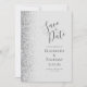 A borda esquerda deste elegante casamento moderno salve o cartão de data apresenta uma borda cintilante. O texto personalizável combina a escrita manual de cinzas de carvão, as fontes em copperplate e itálico em um fundo de cinza pálido. O verso apresenta uma cinza e uma design prateada correspondentes.