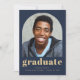 Este anúncio de formatura simples e minimalista apresenta uma foto em forma de arco na frente e uma foto horizontal na parte de trás. A palavra "formando" aparece em negrito tipografia dourada, com o nome do formando, a escola e o ano em sans serif, sobre fundo azul marinho. Adicione uma mensagem mais detalhada sob a foto no verso.