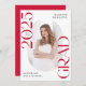 Anuncie a grande conquista do formando em estilo com este anúncio moderno de graduação de fotos. O design de tendência apresenta "Classe de Formando 2025" em letras vermelho em negrito com acentos sutis de script com um fundo branco sólido. A foto vertical do formando é exibida em dentro e oblonga no centro do anúncio. Personalize a frente do anúncio vermelho da graduação com o nome do formando e a escola. O anúncio reverte para exibir uma dentro de foto adicional exibida de um quadro quadrado branco com o texto personalizado mostrado abaixo. O anúncio da graduação em na moda é perfeito para formandos de segundo grau e faculdade.