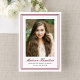 Announce your graduate’s achievement with this classic burgundy photo graduation announcement, designed with a distinguished double line border that frames the portrait with timeless elegance. The graduate’s photo is prominently displayed at the center, creating a strong and refined focal point, while their name appears below in flowing script for a personalized touch. Their school and graduation year are presented beneath in traditional serif lettering, adding balance and a formal academic feel. The reverse side includes space for a custom announcement message, making it easy to share their milestone and express your pride with loved ones. This burgundy graduation announcement is ideal for high school and college graduates and offers a sophisticated way to honor this important accomplishment.