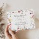 Este clássico e colorido anúncio de elopemento selvagem tem um belo design moderno. A design apresenta flores silvestres brancas, amarelas, roxas e brancas com folhagem em fundo de rosa e aquarela verde. Personalize a placa com os detalhes do seu casamento e use a modelo na parte traseira para anunciar uma alteração de endereço, informações de recepção ou quaisquer outros detalhes que você gostaria de compartilhar.