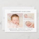 Anúncio de nascimento moderno e simples para apresentar sua linda e fofa garota recém-nascida para família e amigos. As três fotografias na frente dão-vos uma oportunidade excelente para mostrar a todos o quão adorável ela é. A grande foto à esquerda é quadrada e as duas menores à esquerda são as melhores para imagens horizontais. É muito fácil inserir suas próprias fotos neste modelo de colagem de fotos de anúncio de nascimento DIY. Há três linhas de texto que lhe permitem compartilhar o nome dela, estatísticas de natalidade e dar um acolhimento especial. O dorso é uma rosa claro pálida, pastel e macia. Isso pode ser mudado. Todo o texto e a fonte também podem ser alterados para coordenar com as fotos da sua família.