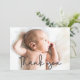 Moderno Elegante Obrigado Sobrepor o anúncio de nascimento da Foto do Bebê - Parabéns sobre o nascimento do seu filho, personalize facilmente este cartão de anúncio do bebê com a foto do seu bebê, nome, data de nascimento, estatísticas de nascimento, saudações especiais e nomes de mãe e pai. Design moderno com um guião chique para a palavra "Obrigado". Obrigado sua família e amigos por todo o duche de amor e anuncia o nascimento ao mesmo tempo.