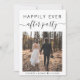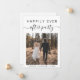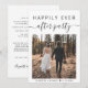 Anúncio de casamento minimalista moderno ou de fuga e convite de recepção para casamentos menores. A frente apresenta a foto do seu dia de casamento e "Festa Feliz para Sempre" em uma mistura de tipografia simples e escrita moderna com floreios. Abaixo da foto, adicione seus primeiros nomes e a data do casamento. No verso, personalize o anúncio do casamento e o convite da recepção com mais detalhes, insira o endereço do site do seu casamento para criar um código QR para que os convidados o leiam e vejam as fotos do seu casamento, todos os detalhes e respondam online, e adicione seus nomes em uma escrita semelhante a uma assinatura.