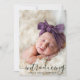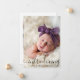 O Anúncio de Nascimento do Bebê com Sobreposição de Fotos Personalizada é um design moderno muito popular que oferece uma imagem de herói na frente abaixo de uma apresentação e uma camada de nomes. A parte de trás tem uma colagem de quatro fotos com modelos para o nome, estatísticas de natalidade e bem-vindas por texto.
