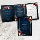 Convite de casamento floral geométrico burgundy azul-marinho escuro com buquê elegante de azul-marinho, azul-real, branco, rosa-choque, burgundy, rosa marsala e folhas de eucalipto verde-sage e moldura geométrica neutra com brilho dourado elegante. Entre em contato comigo para obter ajuda na personalização ou se precisar de qualquer outro produto com este design.