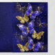 Composição de borboletas luxuosas de safira e joias de ouro em fundo azul texturizado.