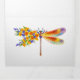 Pintura artificial, libélula floral em laranja e roxo contrastantes com papoila amarela, brilhante e florescente da Califórnia e flores silvestres azuis em fundo branco.