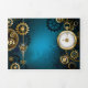 Turquesa, texturizada, fundo steampunk com latão e engrenagens douradas, chave prateada e relógio. Estilo Steampunk.