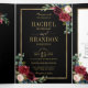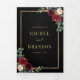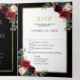 Convite de casamento floral geométrico azul marinho borgonha escuro com buquê elegante de azul marinho, azul real, branco, bege, borgonha, rosa marsala e folhas de eucalipto verde-sage e moldura neutra geométrica com brilho dourado elegante. Por favor, entre em contato comigo para qualquer ajuda na personalização ou se você precisar de qualquer outro produto com este design.
