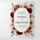 Convite de casamento com tema floral elegante burgundy vermelho, terracota, laranja terroso com um buquê elegante de rosas burgundy, peônias cor de terracota e folhas de eucalipto verde. Por favor, entre em contato comigo para obter ajuda na personalização ou se você precisar de qualquer outro produto com este design.