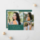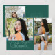 Cartão de foto de anúncio de graduação moderno e caprichoso com 3 fotos na frente e 1 no verso. O texto diz "comemorando o graduado" em fonte de caligrafia. Adicione o nome do graduado, informações e mensagem para personalizar este cartão. Verde.