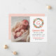 Este moderno cartão de anúncio de nascimento de fotos apresenta sua doce menina com uma foto recém-nascida adjacente a uma coroa floral de cor d'água com um monograma vermelho personalizado de laranja. Personalize o texto personalizado para incluir o nome do seu bebê no script, juntamente com informações importantes sobre natalidade e nomes dos pais. A queda branca do design floral inclui flores coloridas de aquarela, folhas e verde em tons de rosa-pincel, amarelo-ouro, vermelho-alaranjado-coral, violeta-púrpura e verde. Um padrão de coordenação de pontos de abstrato em um plano de fundo cor-de-rosa pincelado (pode ser personalizado) se veste no lado traseiro da placa.