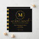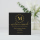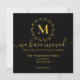 Este cartão de anúncio de mudança é sofisticado e elegante. Apresenta um fundo preto com uma coroa monograma botânica dourada e tipografia dourada.